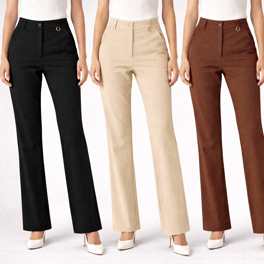 A calça de perfeita para quem busca sofisticação, conforto e versatilidade no dia a dia. Com modelagem reta e cintura média/alta, ela valoriza a silhueta e garante um caimento impecável. O design clássico com fechamento frontal e detalhe de argola metálica traz um toque moderno e refinado à peça.