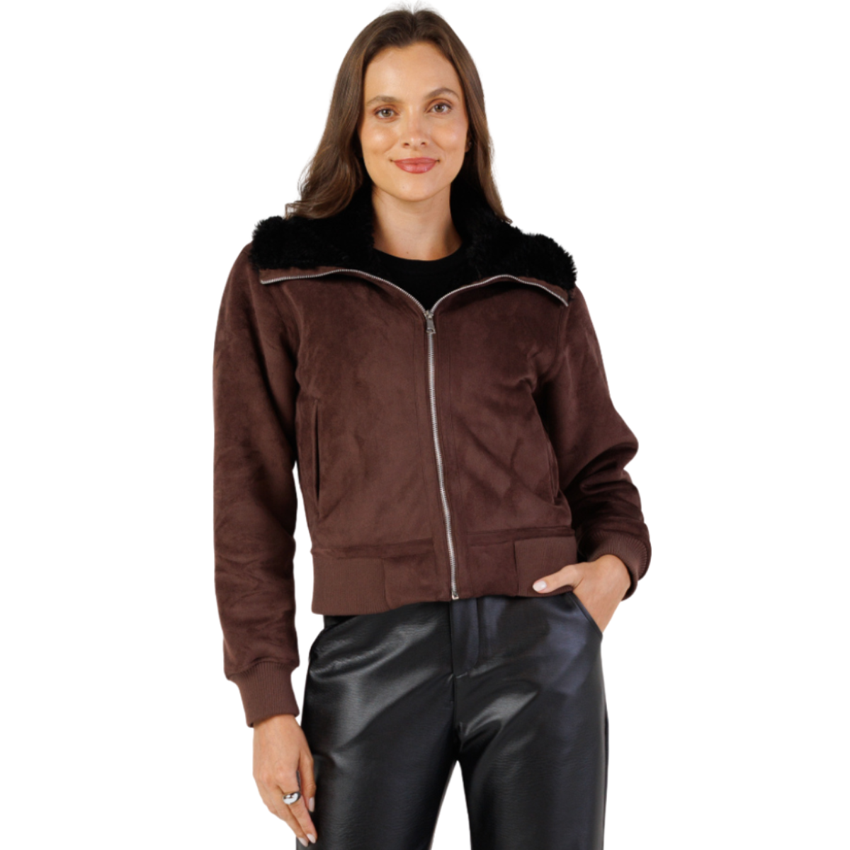 Inspirada no clássico estilo aviador, esta jaqueta combina conforto, elegância e um toque moderno para os dias mais frios. Confeccionada em camurça sintética de toque macio, a peça possui forro interno peluciado que garante maior aconchego e proteção térmica.