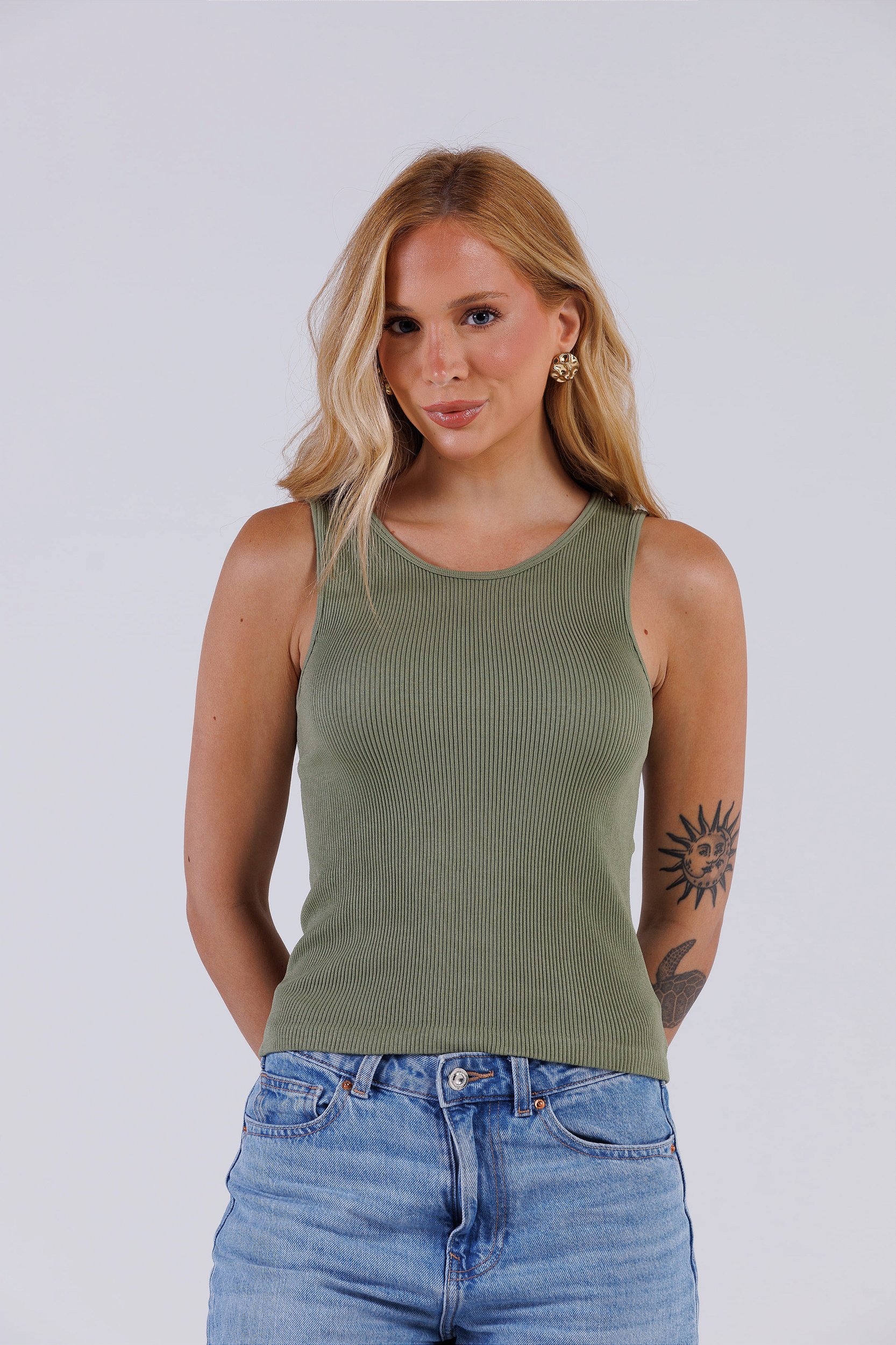 O decote arredondado e as alças largas trazem um visual moderno e atemporal, ideal para diversas combinações. Versátil, a regata pode ser usada com jeans, saias, shorts ou calças de cintura alta, criando produções casuais ou mais sofisticadas.